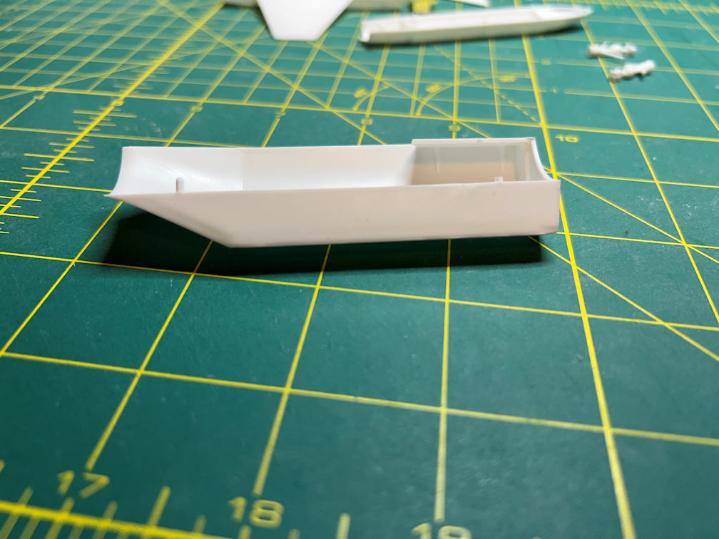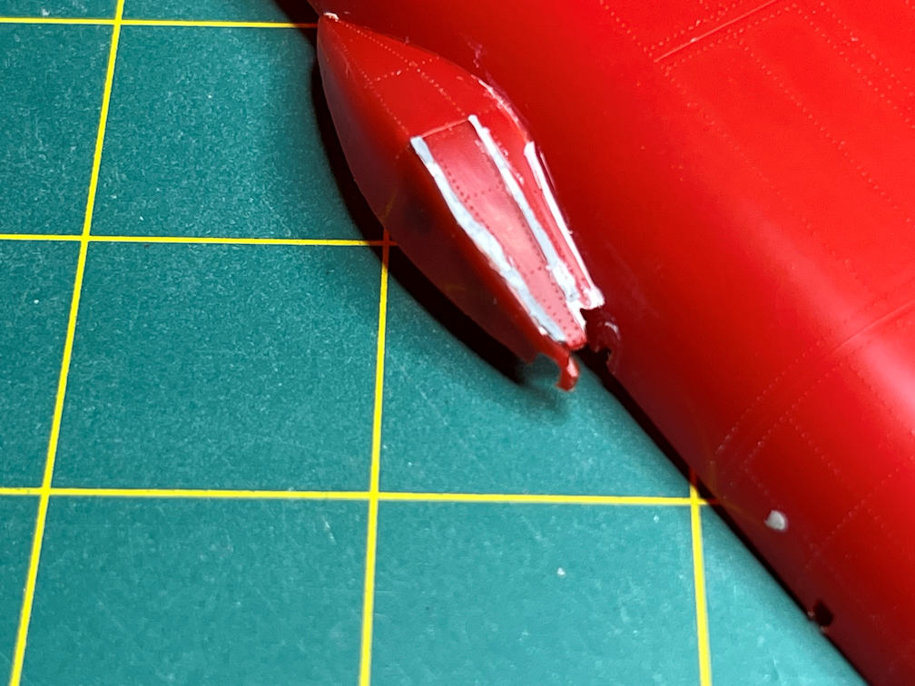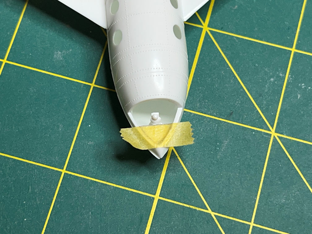 I also did a bit of work on the Orbital Rocket. I dry fitted the drop tanks and trimmed off the excess peg that protrudes into the engine area. This isn’t a problem for the Passenger rocket since it had no drop tanks. But I did need to fill the holes that would have been used to attach them (one of which is visible in the above photo).