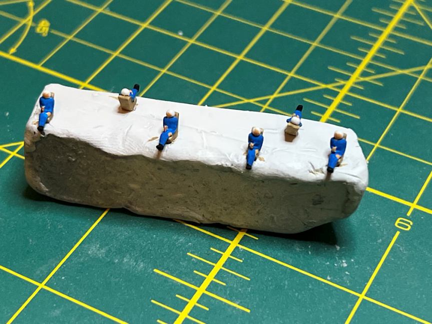 I pushed each figure into a block of clay and then sprayed them with Tamiya white primer. I then painted each figure the same way. Each had a blue uniform made by mixing three drops of Vallejo 71.004 Blue with one drop 71.001 White. I painted the boots Vallejo 71.057 Black. The white helmet was Tamiya White Primer. I used Tamiya XF-15 Flat Flesh for the hands and face. The seat was painted Vallejo 71.028 Sand Yellow. When the paint dried I gave them an overall coat of Tamiya Flat Clear.