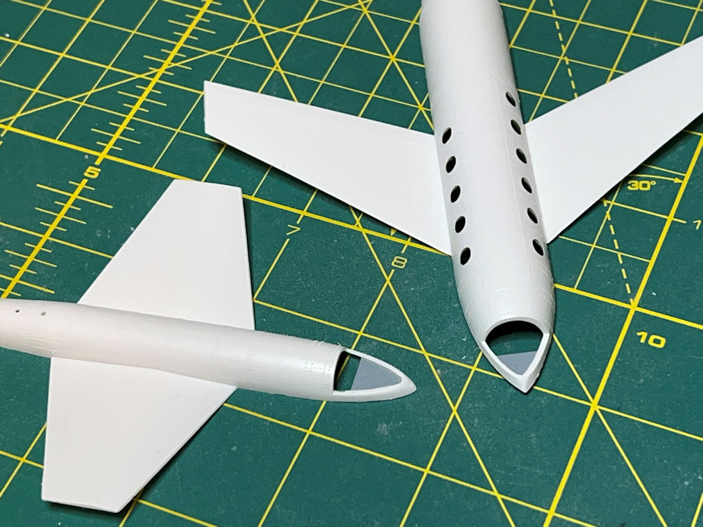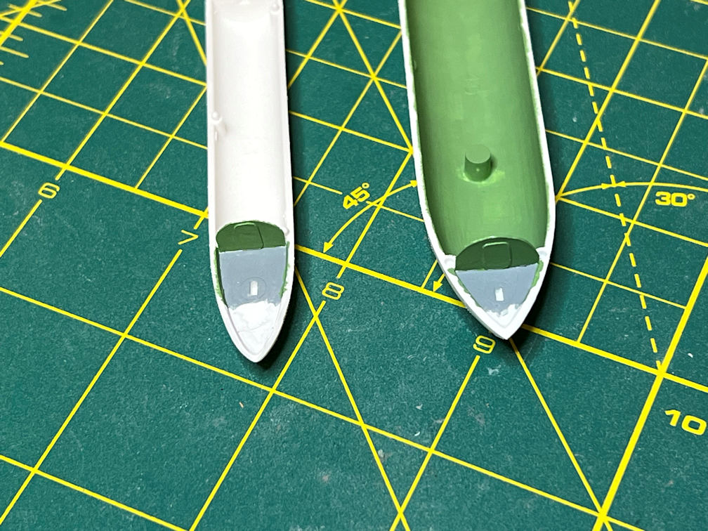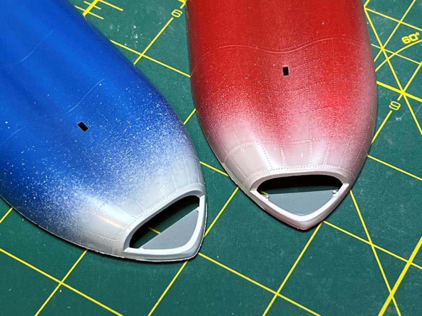 The cockpits of the first stages were treated the same way. If you look closely at the one on the right, you can see some small cracks in the paint of the cockpit floor. The Tamiya Flat Clear seems to have attacked the gray paint. I’ll fix that with a refresh of Dark Ghost Gray and a lighter mist coat of the Flat Clear. I’ve had that happen before when applying Tamiya clear coats over Vallejo paints. It usually indicates that I’ve sprayed a coat of clear too heavily.