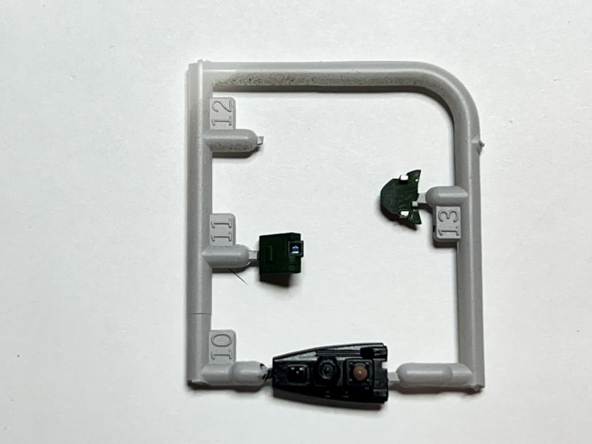 I then took the sprue with the cockpit parts and primed and painted them on the sprue. Part 11 got XF-5 Green overall and X-3 Royal Blue for the gunsight projector. Part 13 got XF-5 Green overall with X-18 Semi-gloss Black and X-11 Chrome Silver on the projections. Part 10 was painted XF-18 Semi-gloss Black and one part of it was painted XF-52 Flat Earth. I’ll probably drybrush some silver on part 10 to highlight the details.