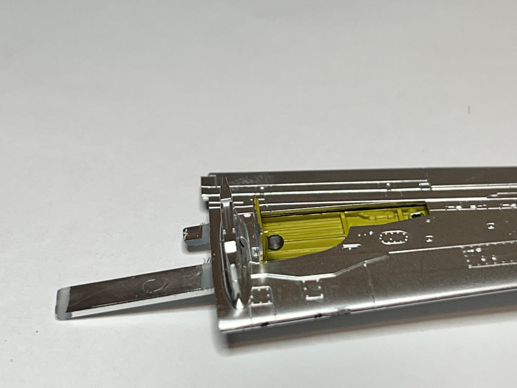 This week’s work began by painting the main wheel bays with Tamiya XF-4 Yellow Green. You might be able to tell from the above photo that I also scraped the silver paint from the glue areas.