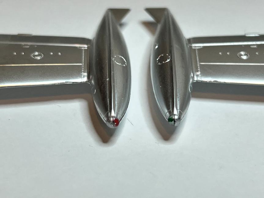 The navigation lights that attach to the front of each wing tank have a glue peg that is off center. This allows you to paint the left and right navigation lights with a dot of X-7 Red or X-5 Green next to the glue peg. I painted the half of the light that is closest to the cockpit XF-16 Flat Aluminum. This was used on the actual F-84G to keep the lights from interfering with the pilot’s vision. Here is a closeup after attaching them to the tanks.