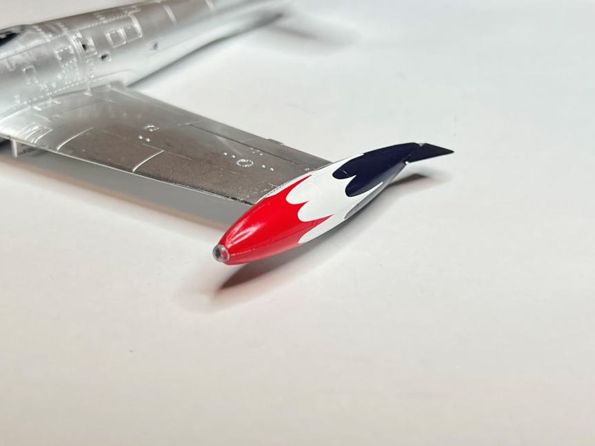I want to depict the plane of the first lead pilot of the Thunderbirds, Major Richard Catledge, as it looked in early 1953. The pilots and the years they flew with the Thunderbirds is well documented. As are the serial numbers of the planes that the Thunderbirds used. But connecting the pilot name with a specific serial number of a plane is the hard part. I found a document that showed which planes were used in the diamond formation, but it didn’t indicate what position in the diamond the plane was flown. There was some photographic documentation that showed serial 116720 was flown by Capt. “Bill” Pattillo in 1953 and 116719 was flown by Maj. Jacksel Broughton (the second leader of the Thunderbirds) in 1954. I used an assumption that Maj. Catledge would have turned his plane over to the new leader, Maj. Broughton. Which would indicate that Maj. Catledge would have flown serial 116719 in 1953. So that’s what I’m going with.