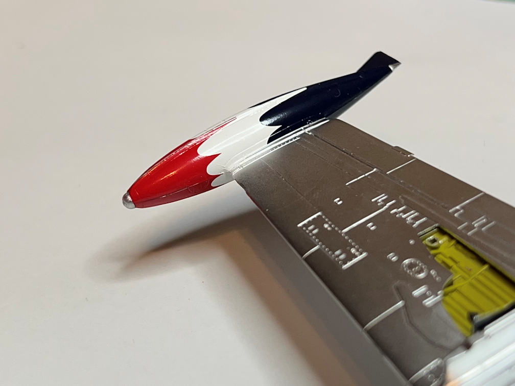 The photo above shows the first few things I got done this week. I glued on the nose/air intake and applied the left and right Thunderbird decals to the nose. These decals are a bit thicker than the black lettering decals that I had applied previously. I didn’t have any problem with curling after the initial application. They did need some Solvaset to get them to conform to the fuselage details. But the decals reacted well and look great. Unfortunately the recommended TS-8 Italian Red used on the intake is just a bit darker than the decal. It’s a close shade so I’ll just go with it.