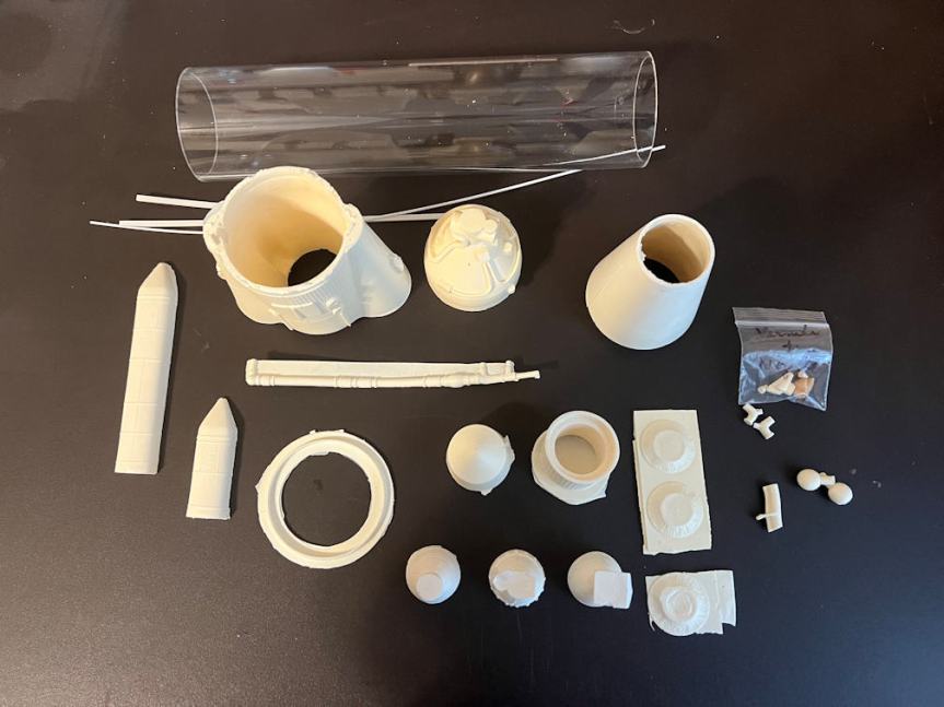 When the kit arrived it was in a plastic bag which was not a huge surprise. After all this is pretty much a garage kit. It was mostly cast resin parts with a clear acrylic tube for the main body. Looking at the parts through the bag, I was a bit disappointed to see that the resin parts were rather rough. It looked like the parts were cast from molds that were beginning to wear out and needed to be remade from their masters. Also there were quite a few bubbles in some of the castings. The parts definitely did not look as good as the ones in the photos on the Ninfinger Quick Look page. I put the kit in my stash and planned to get to it soon.