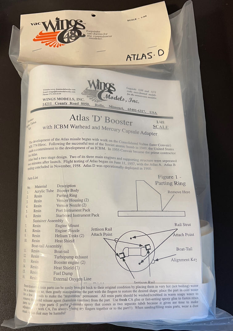 My next model build is a 1/48 scale Atlas D rocket by Wings48. I bought this kit back in 2005 from Don’s Model Works who was producing the kit lines by Wing48, Wings72. This kit was originally produced by Eagles Talon Models. The Don had aquired the Wings48 and Wings72 lines a couple of years earlier. Then in 2004 he acquired the Eagles Talon kits. I had heard of the kit when it was produced by Eagles Talon, but never got around to getting one. When in 2005 I saw that the kit had changed hands and was now put out by Don’s Model Works, I decided that I had better get one sooner rather than later. The owner of “Don’s” died in 2011 and by all accounts none of the kits produced by Wings or Eagles Talon are being produced anymore. You can occasionally find one on E-bay, usually for collector prices.