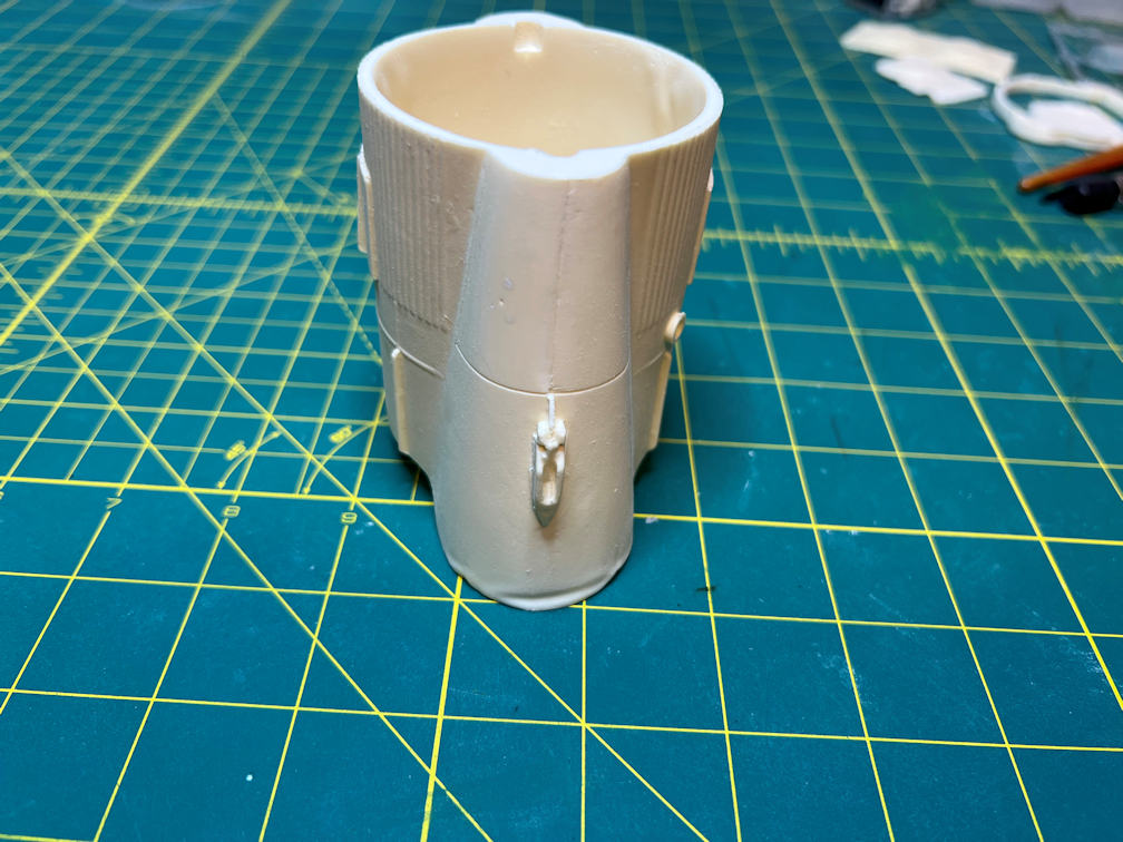 I also started on the sustainer engine. It differs from the booster engines. It has a turbo pump exhaust that wraps around the nozzle. It also has many angular protrusions that have bubble holes in almost every one. Here you can see I’m in the process of trying to fill the holes.