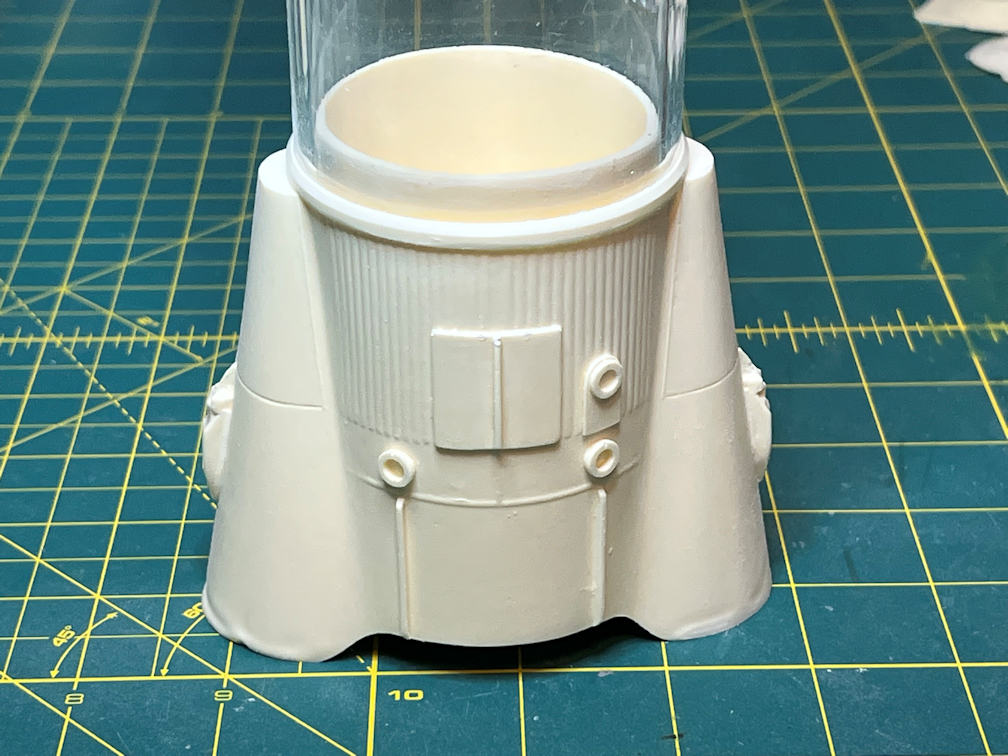 I also cleaned up the Mercury capsule adapter. The stringer section of the adapter is very rough and the molded in stringers have very soft edges. There is no provision for the oxygen vent on the side either. Since I have to scratch build the vent and cover, I’ll sand off all the stringers and apply my own. I’ve got a set of David Weeks Mercury Atlas drawings from RealSpace Models, so I’ll use those as my guide for correcting this part.