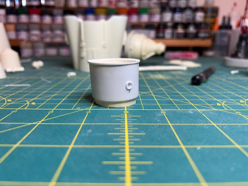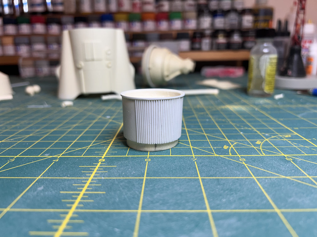 Apparently the adapter is still just a bit too small for a true 1/48 scale. I found this out while I was using Affinity Designer 2 to create a couple of marking guides for the top and bottom of the capsule adapter. I started by making the pattern the length of the circumference of the upper and lower edges. I then put 108 small lines along that length. It was apparent that I just didn’t have enough room for all 108 stringers. I started removing them until I had a better spacing between stringers. I ended up with 102. Missing 6 will hardly be noticed so I’m good with 102.
