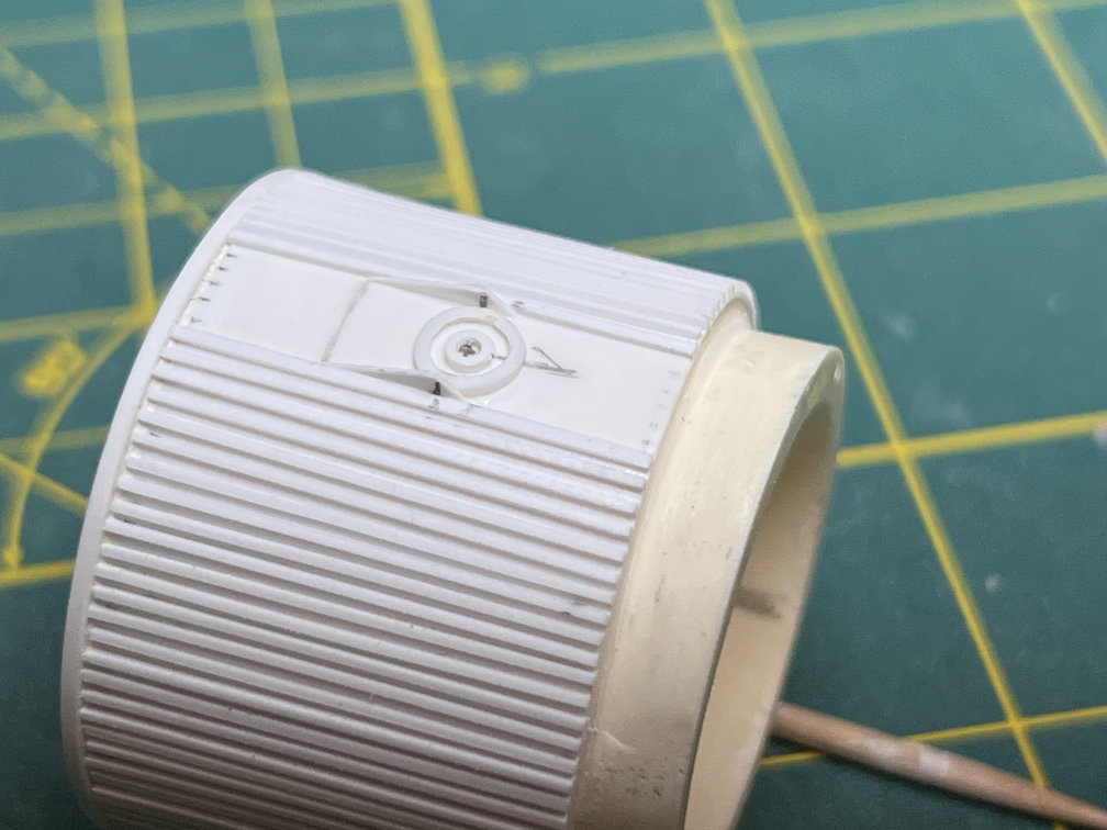 Before attaching the stringers, I cut a thin section of 3/16″ styrene tube to represent the oxygen vent on the side of the adapter. Next the center point of the vent was measured and marked and then the ring was glued in place. Here is a photo of it installed.