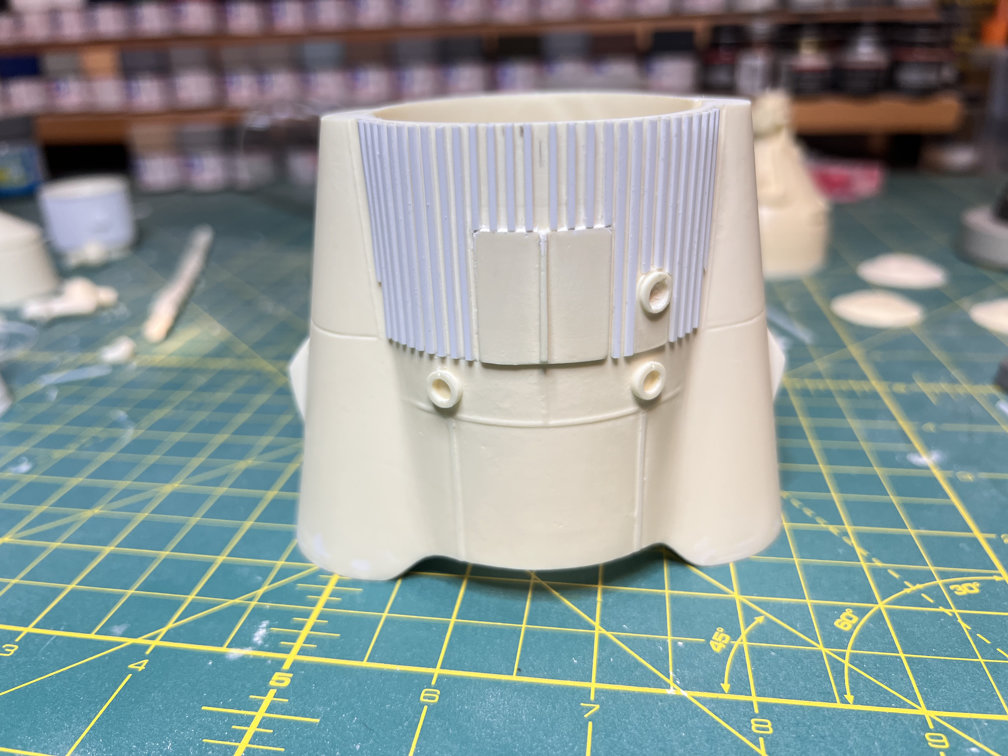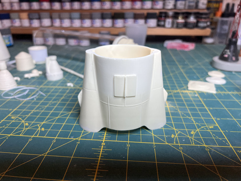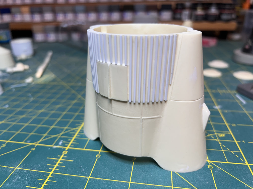 While studying the model and what I had done with the stringers on the capsule adapter, I decided that I had to fix the stringers on the boat tail. I sanded down the molded in stringers on one side of the part. I was able to sand down all the raised parts without much trouble. Also note on the lower part of the boat tail I sanded down some molded in strips that were much too tall. I sanded them to match the other raised parts on the lower boat tail.