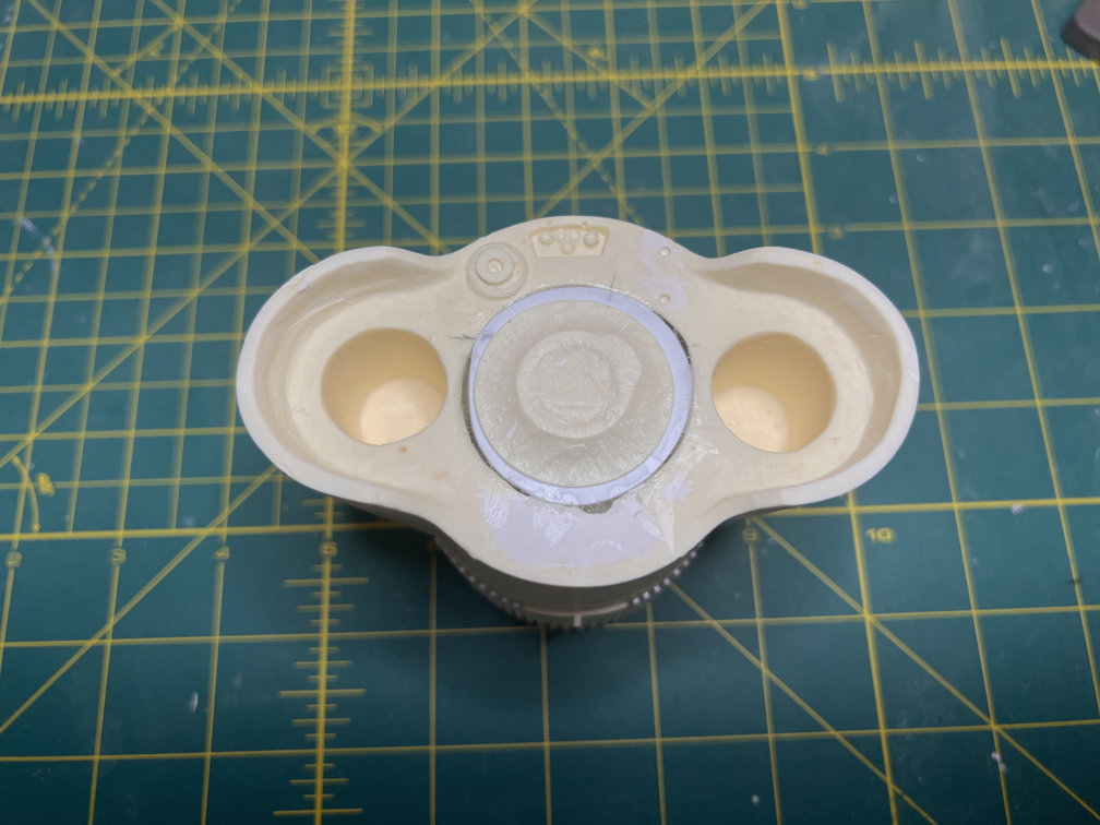 I then started on the under side of the boat tail where the nozzles will be. There is a much too large hole for the center nozzle to pass through. I made an approximate pattern for the hole and then cut a disk of 0.040″ sheet stock. I made a few adjustments to get the disk to fit the hole and then used some Plasti-zap CA glue to hold it in place. Blue painters tape was applied over the disk on the outside to keep any epoxy from seeping out of the edges. I then mixed up some 5 minute epoxy and applied it to the edges of the disk on the inside of the hole. Here is a photo after the blue tape was removed.