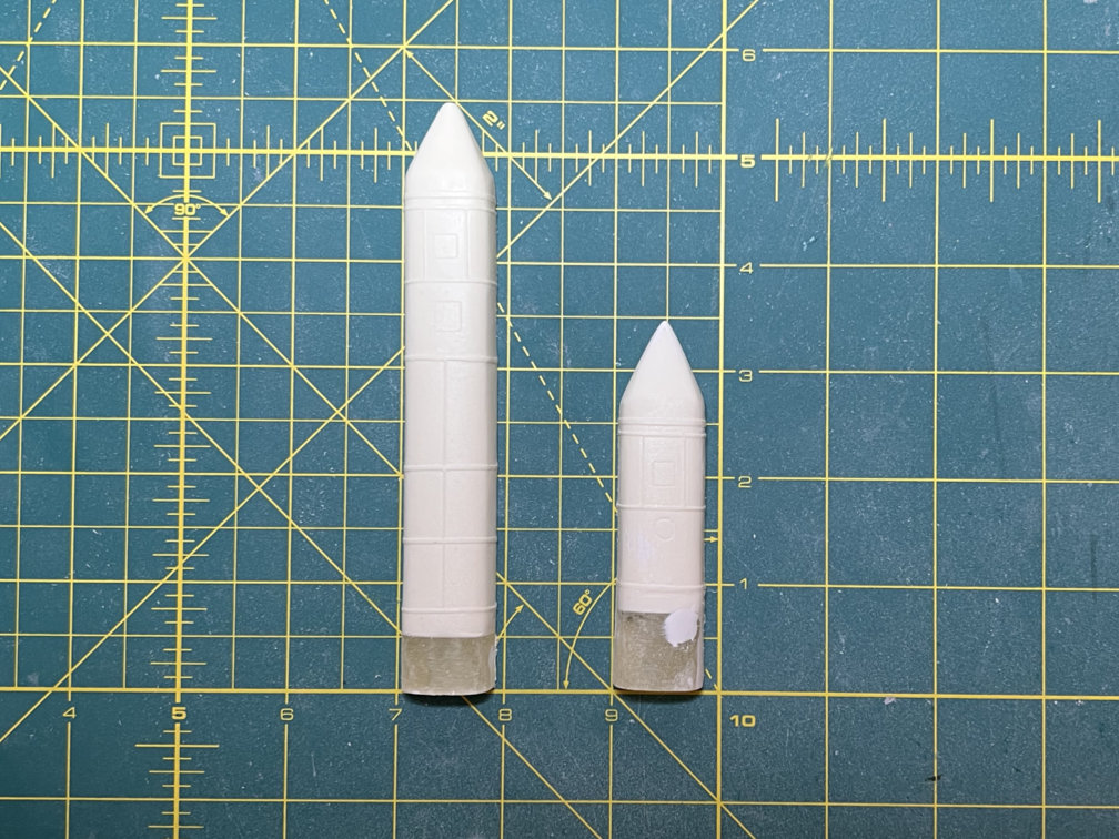 The long pod will also have a 3/8″ long smaller diameter section added to the end. I think I’ll do that with some 0.040″ and 0.010″ sheet styrene. I’ll make patterns based on the drawings and then assemble the bits and glue it to the end of the pod.
