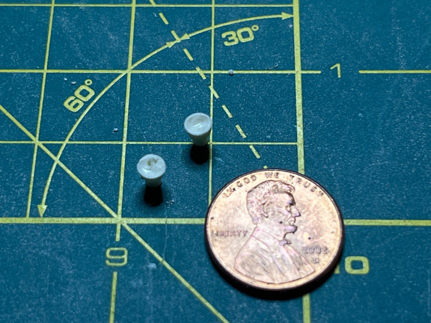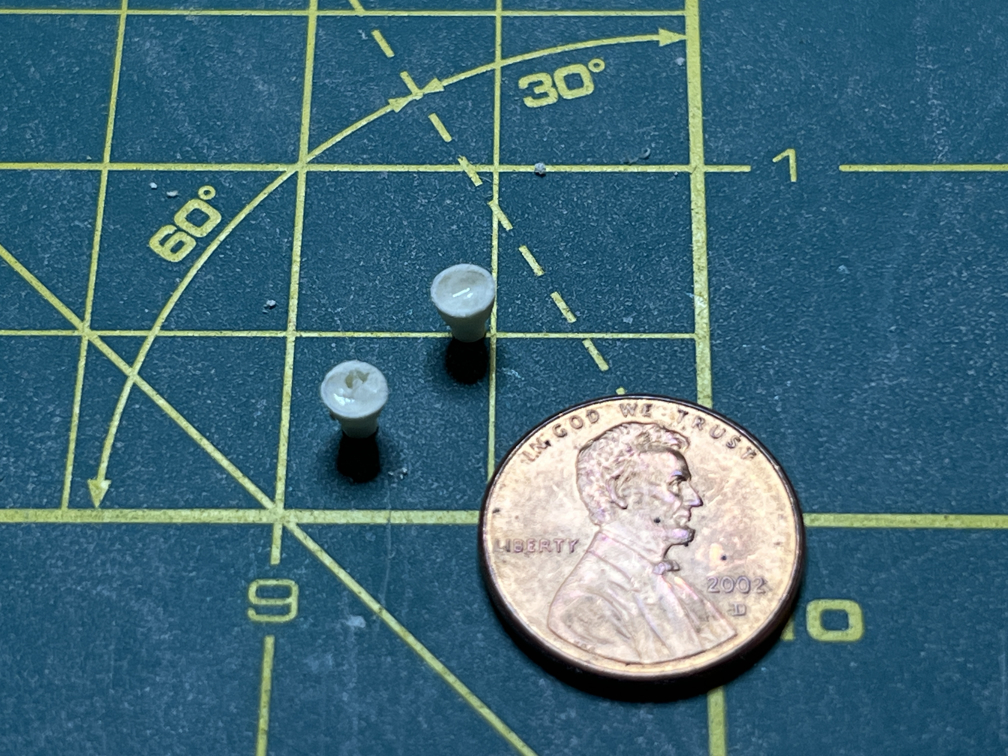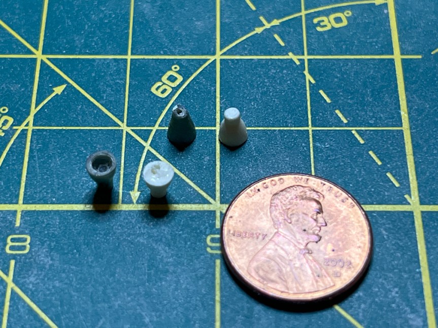 Next on the build, I opened the small zip-lock bag that contained the vernier motors for the Atlas. The above picture shows the parts from the bag. The instructions say to drill out the nozzles to make them look like real nozzles. I would have done that even if it wasn’t in the instructions but then I noticed a problem. There was a major bubble in one of the nozzles. This would make it very hard to drill a hole down the middle. I don’t have any way to clamp something that small in order to use my drill press. Drilling it by hand would be nearly impossible since the drill would follow the bubble as soon as drill bit hit it. Here is a photo of the nozzles.