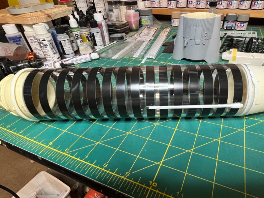 I then regretted attaching the tunnel before scribing the lines. It made marking the tube just a bit more difficult. I’ll be scribing the right side of each tape band. For the tapered cone of the resin section I used Tamiya vinyl flexible tape. That helped me get a more accurate curve on the scribe lines. I also added four additional marking lines to help get the tape to the correct shape. Here’s a photo.