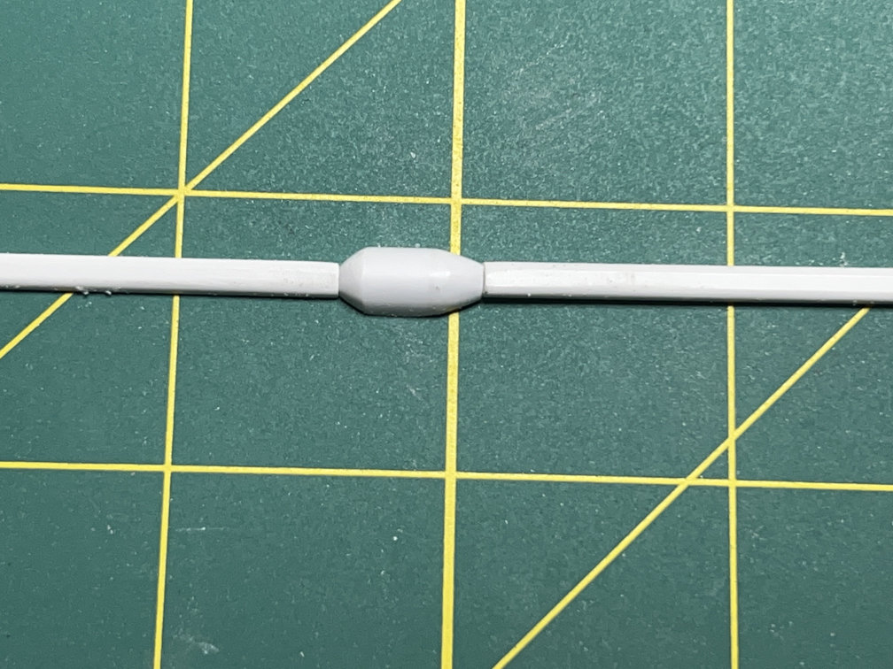 Next I used some 1/4″ half round stock cut 1/2″ long to create a rate gyro housing. I marked where the tapers started and then sanded a taper from the mark to the end to match the instrument tunnel. Here they are just laid next to each other. I also sanded a curve into the back of the rate gyro housing to match the curve of the Atlas body.