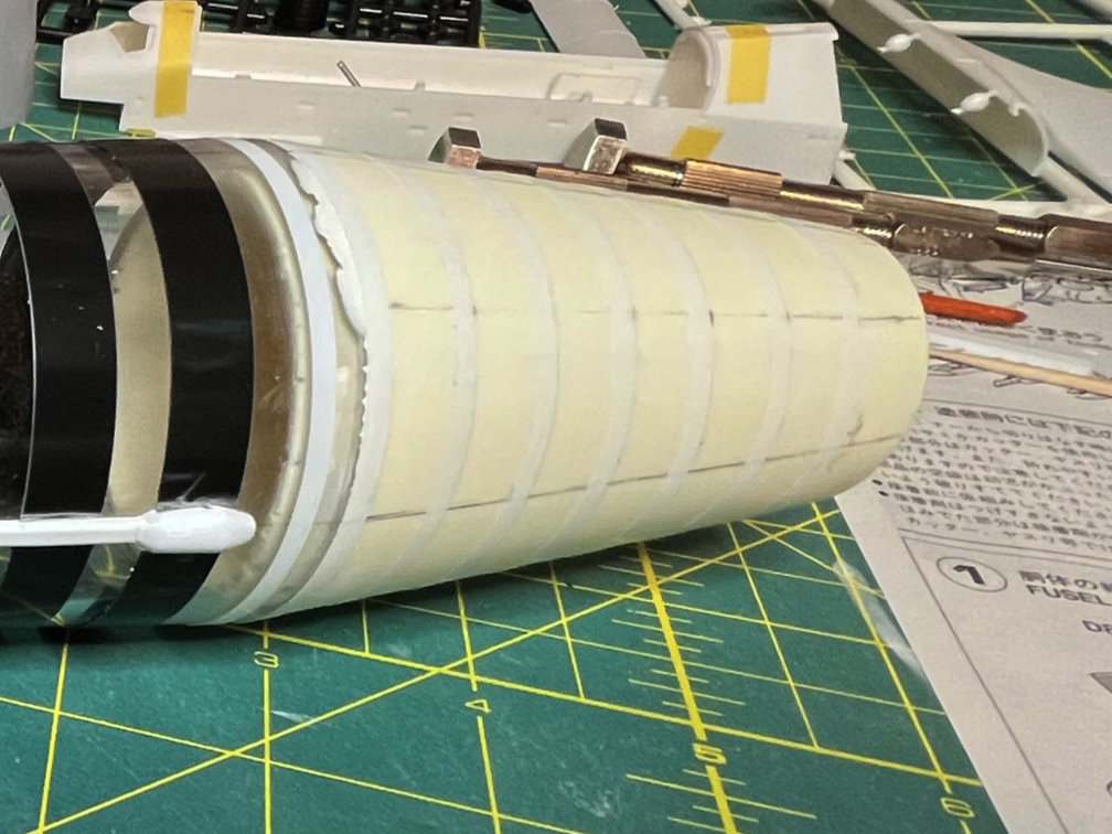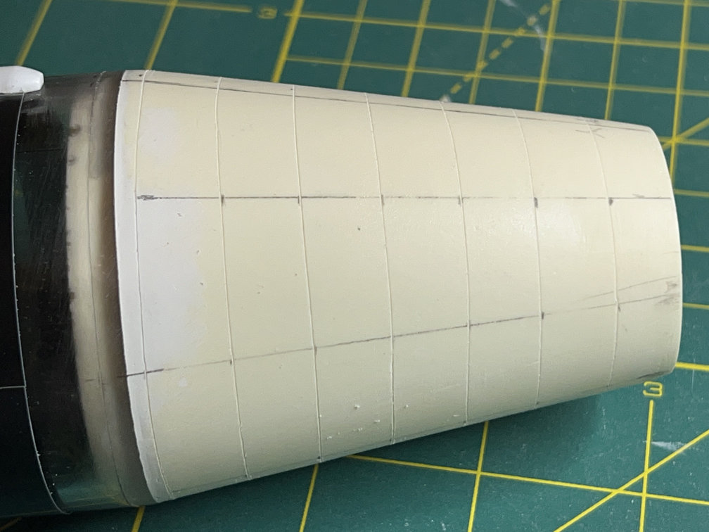 I then regretted attaching the tunnel before scribing the lines. It made marking the tube just a bit more difficult. I’ll be scribing the right side of each tape band. For the tapered cone of the resin section I used Tamiya vinyl flexible tape. That helped me get a more accurate curve on the scribe lines. I also added four additional marking lines to help get the tape to the correct shape. Here’s a photo.