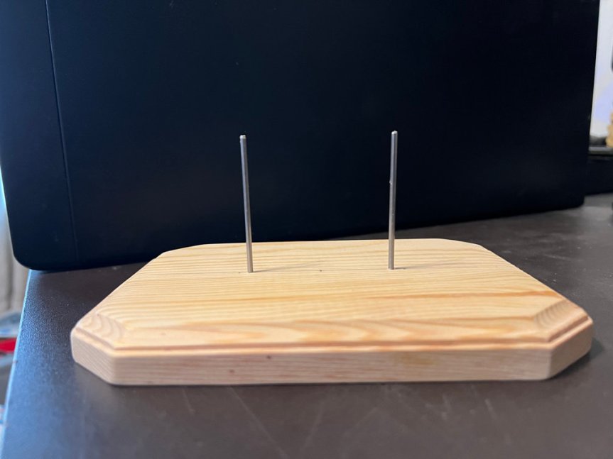 It’s about time I post an update on the Mercury Atlas. Progress has been slow but steady. The above photo shows the booster section of the model. I drilled two holes about 1 1/4 inch deep into the center of each nozzle. This will allow the model to be placed on the base which has two steel rods inserted into the wooden base as you can see below. The camera makes the rods less straight than they are.