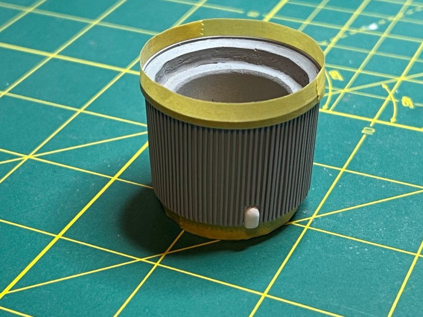 Here are two views of the completed capsule adapter. One shows the top of the tunnel and the other shows the oxygen vent after I painted it with Tamiya Aluminum.
