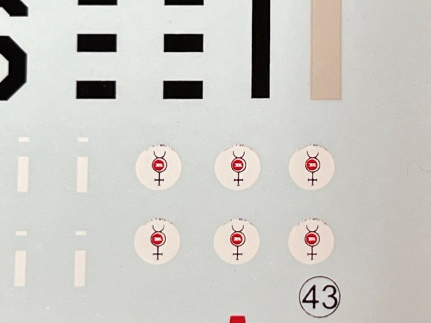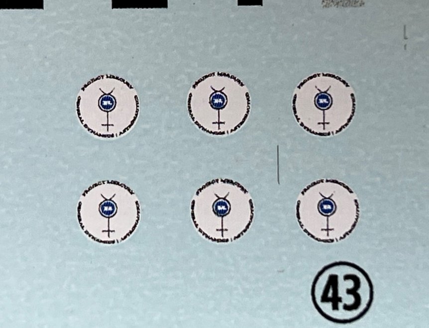 While I was drawing them I noticed a decal on the Horizon sheet I had not seen before. It was a white circle with some design inside. The 1/72 image was too small to fully make out all the features, even when blown up to 1/48 scale. It did look like it was the symbol for Mercury with a red circle inside and something in white inside the red circle. It also looked like there was some text around the edge of the white circle. I needed to find a photo of that marking so I could properly draw it.