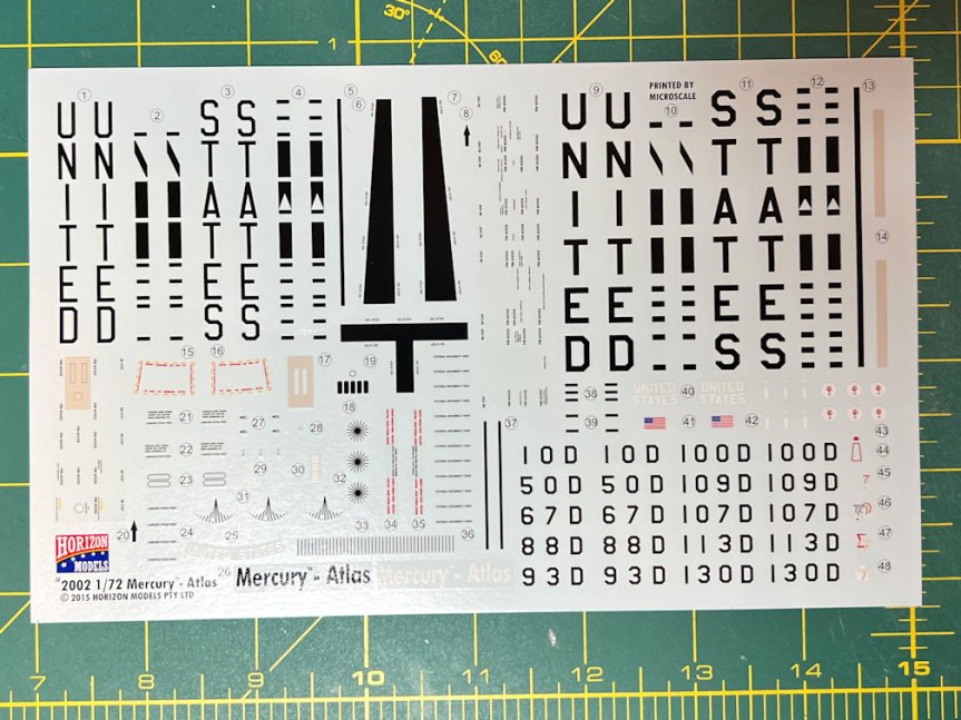 The Horizon decal placement sheet shows where to apply all six decals. They give the correct position for MA-6 and MA-7. They are missing separate placement for MA-8 and MA-9. They show two more logos placed inside the “CUT HERE FOR EMERGENCY RESCUE” boxes on one side of the booster section. Then another two with one on each side of the booster engine fairings just off the center line. I can only find one photo that shows possible additional logos (MA-1 Atlas 50-D) might be there. I’m not saying that Horizon was wrong, just that I haven’t yet found any evidence that they were there.