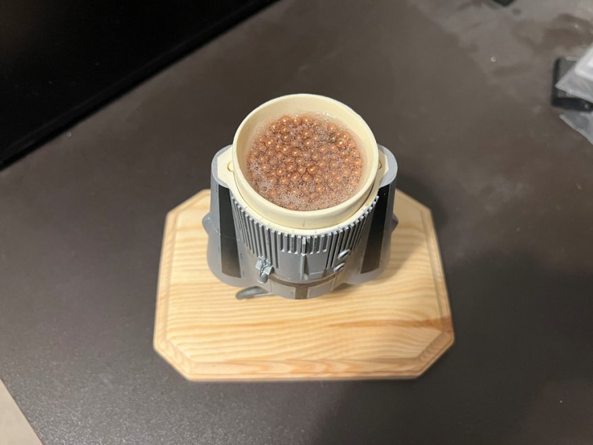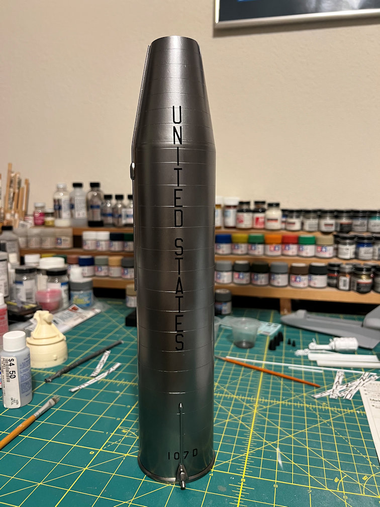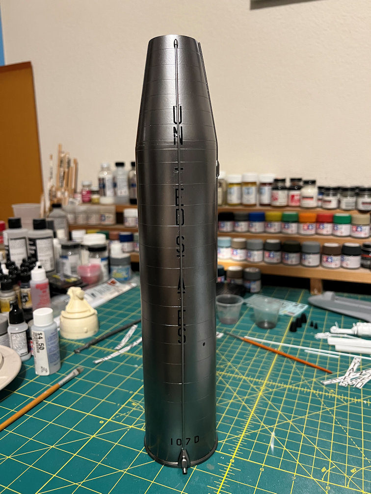 I also put a bunch of BB’s in the sustainer base and poured some epoxy on to keep them in place. My main reason for this was to add more weight to the bottom of the model to help damp out any swaying that might happen if the model is touched from the side.