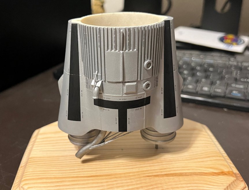 I finished the capsule adapter by cutting part of three stiffeners off to allow the upper part of the tunnel to be added. Here the part has been added and the whole assembly is ready for final primer and then a coat of Tamiya Black to be sprayed on.