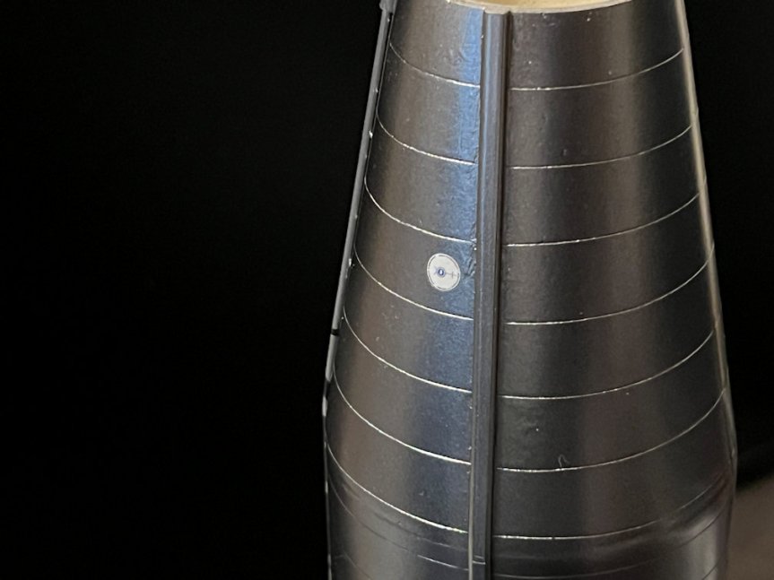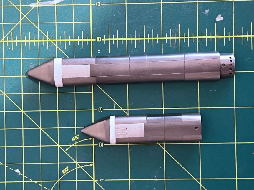 Some 1/16″ plastic rod was added for the framework that braces the turbine exhaust to the base of the rocket. That completes construction of the booster section.