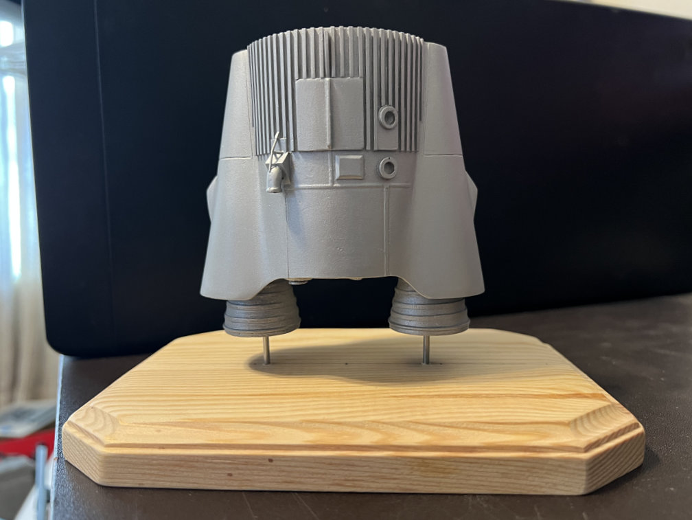 Here is a photo of the booster section attached to the base. The base will be sanded, primed and then painted flat black. The two rods should be strong enough to hold up the weight of the rocket. The model will sway a little bit if it is pushed, but it will remain securely attached to the base.