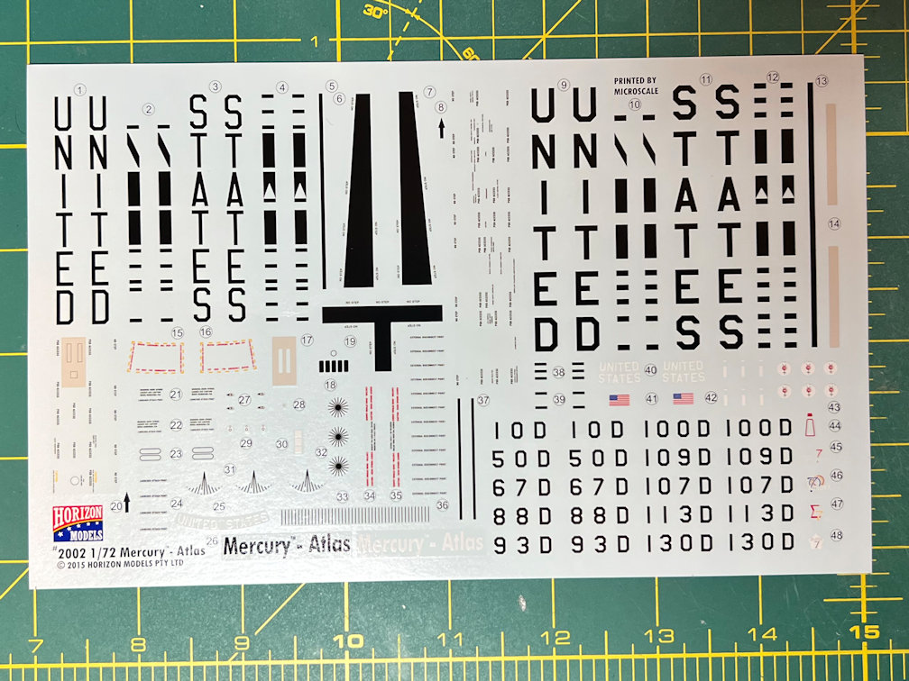 I’ve been spending quite some time drawing the decals for this model. I started by scanning the Horizon 1/72 Mercury Atlas decals at 600dpi. I then enlarged them to 1/48 scale. I loaded that into Affinity Designer 2 and started drawing my decals in layers above the background Horizon decals.