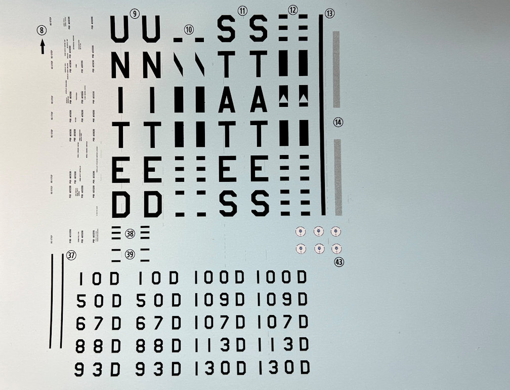 To get my decals to print properly I had to break the page up into two parts. Here is a photo of one half of the decals. This half does not have the walkway patterns. I kept the decal numbers so I could use the Horizon decal placement call outs.