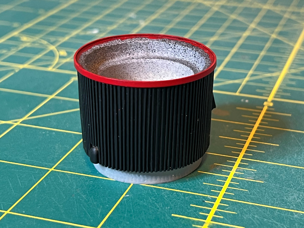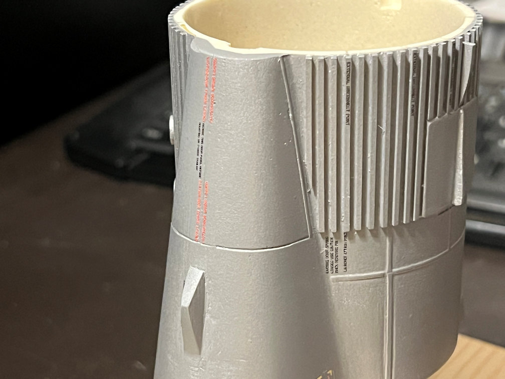I finished the capsule adapter by cutting part of three stiffeners off to allow the upper part of the tunnel to be added. Here the part has been added and the whole assembly is ready for final primer and then a coat of Tamiya Black to be sprayed on.
